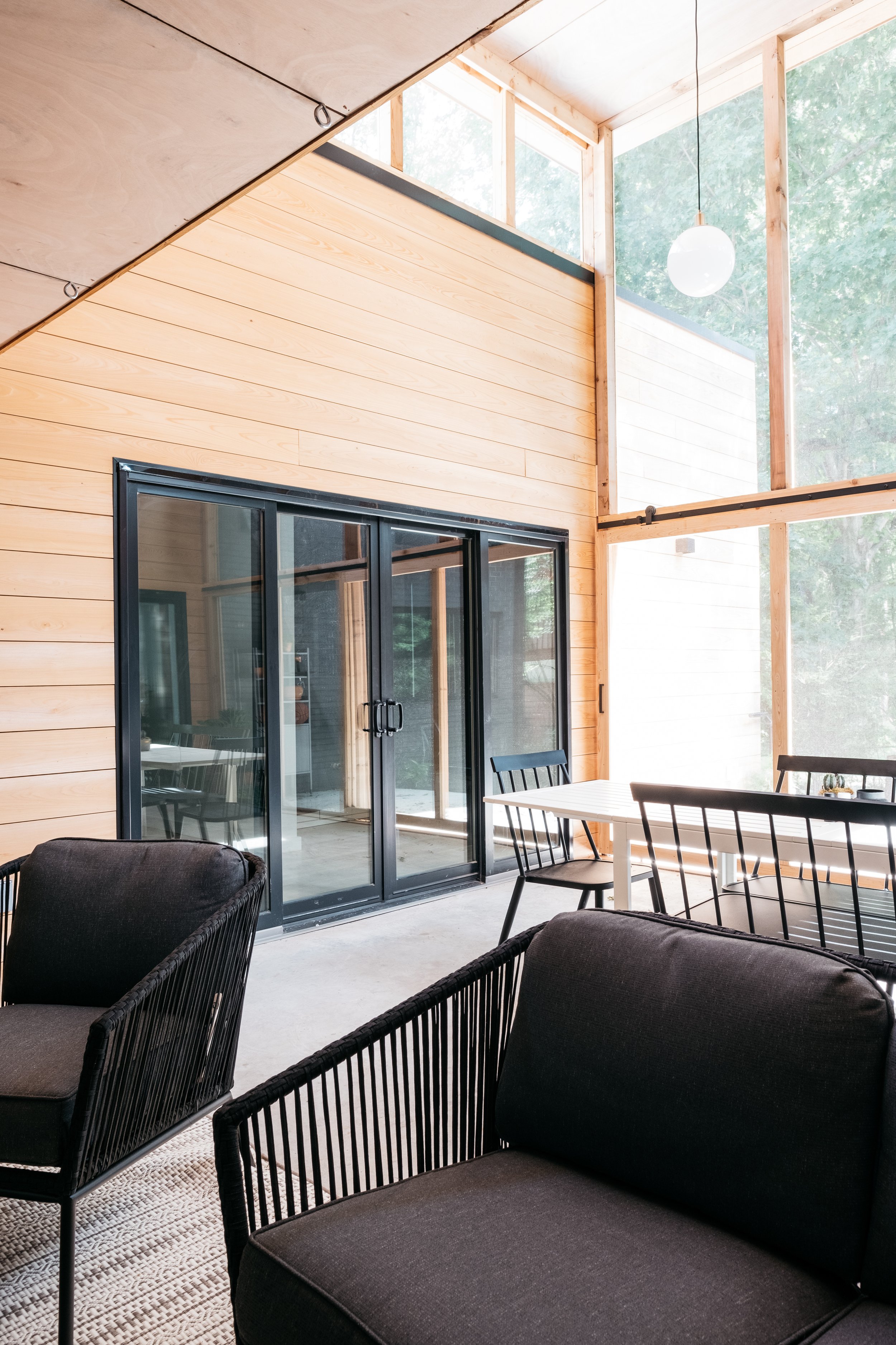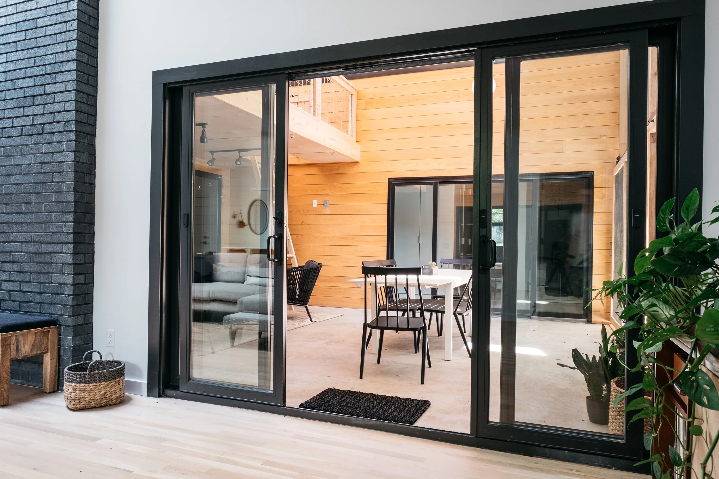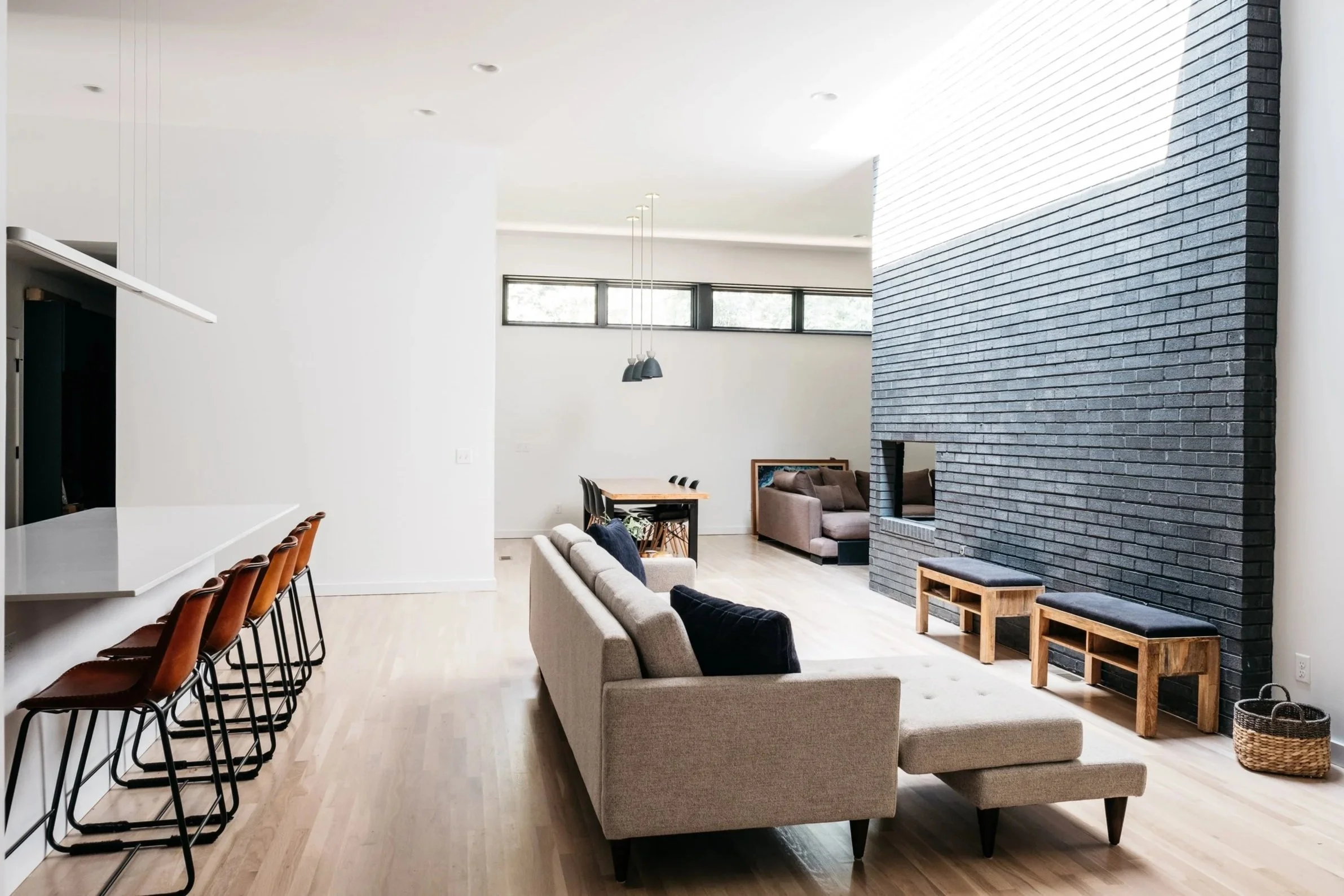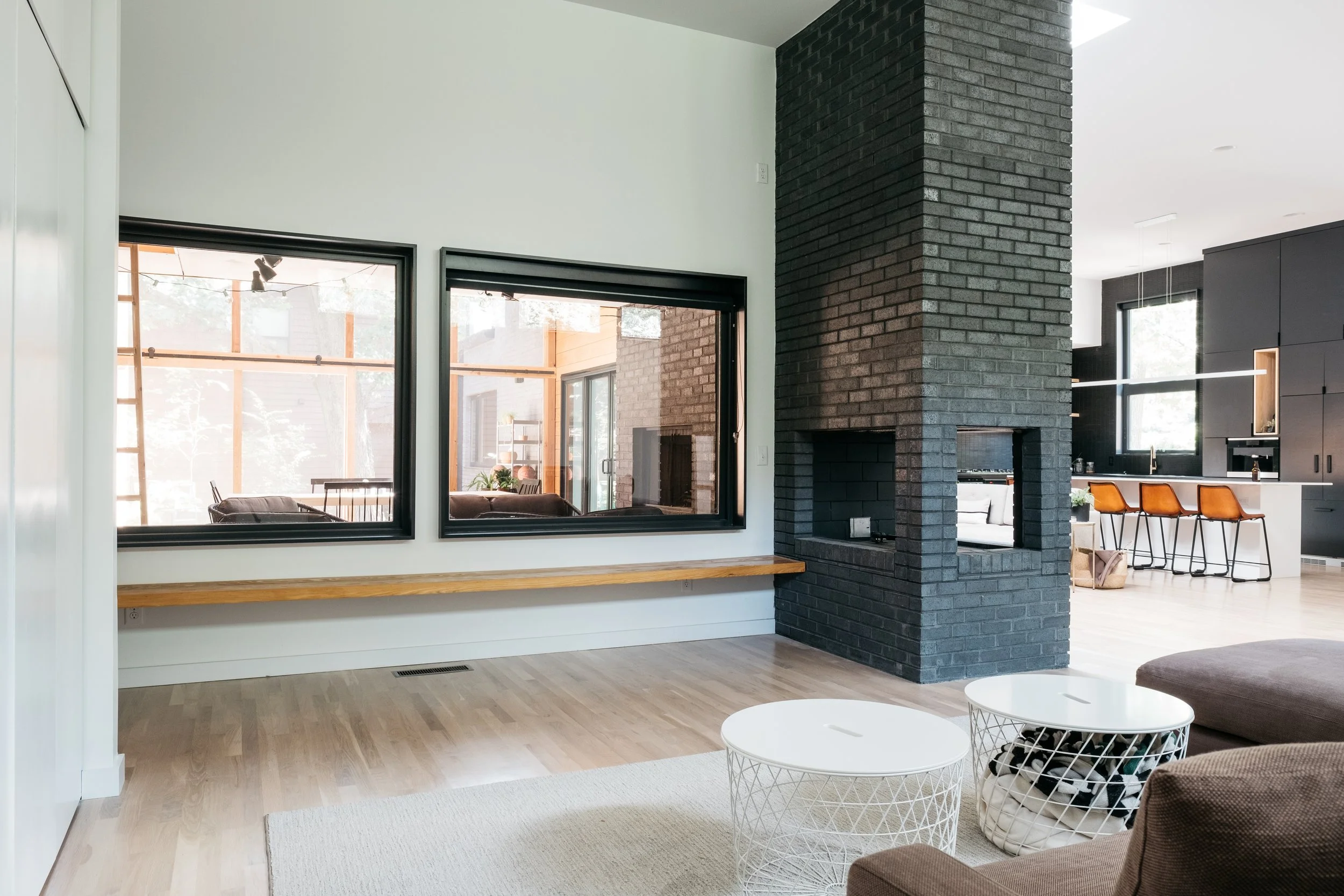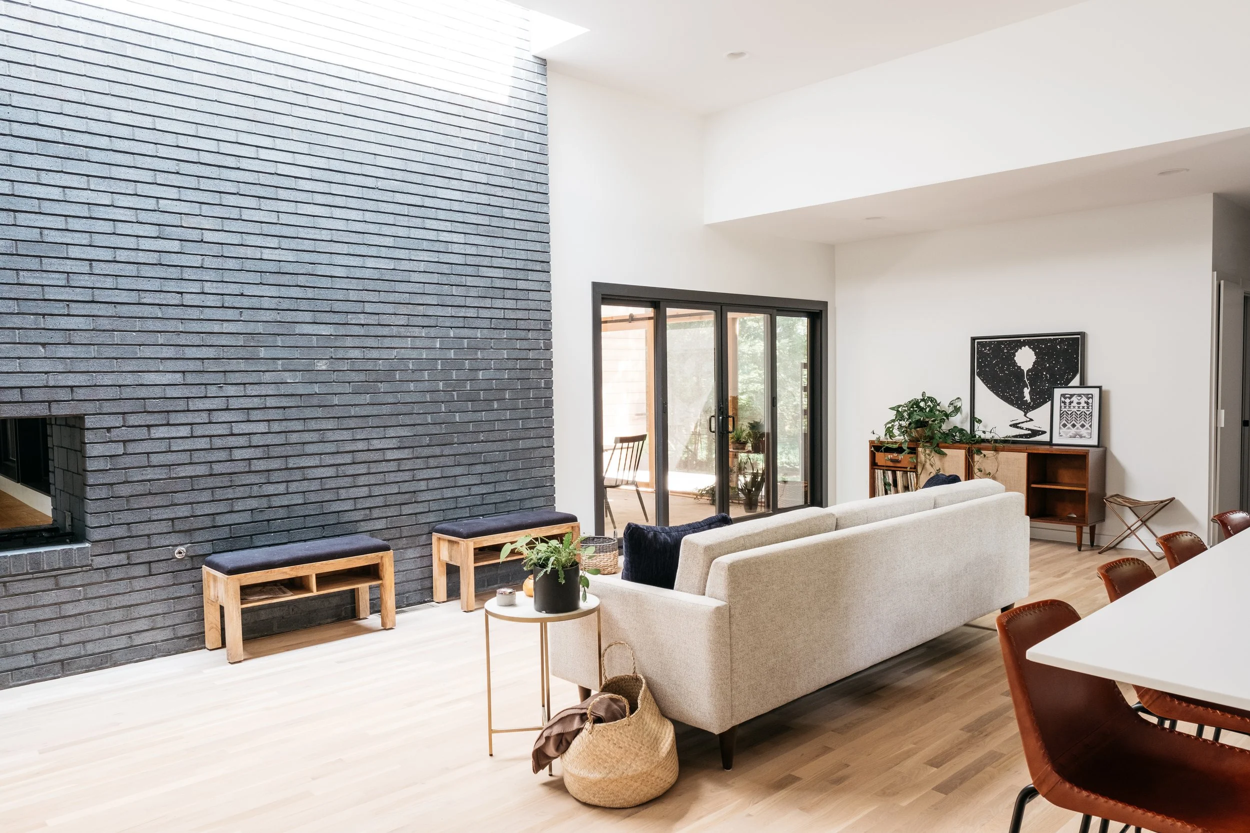 At the heart of the project is a monumental brick hearth that serves as both threshold and hinge. It organizes the transition between old and new, interior and exterior marking a pivotal moment in the plan while also providing warmth on both sides: a fireplace for the living room inside and one for the porch beyond. It’s not only a functional anchor but a symbolic one, grounding the house in both memory and use.