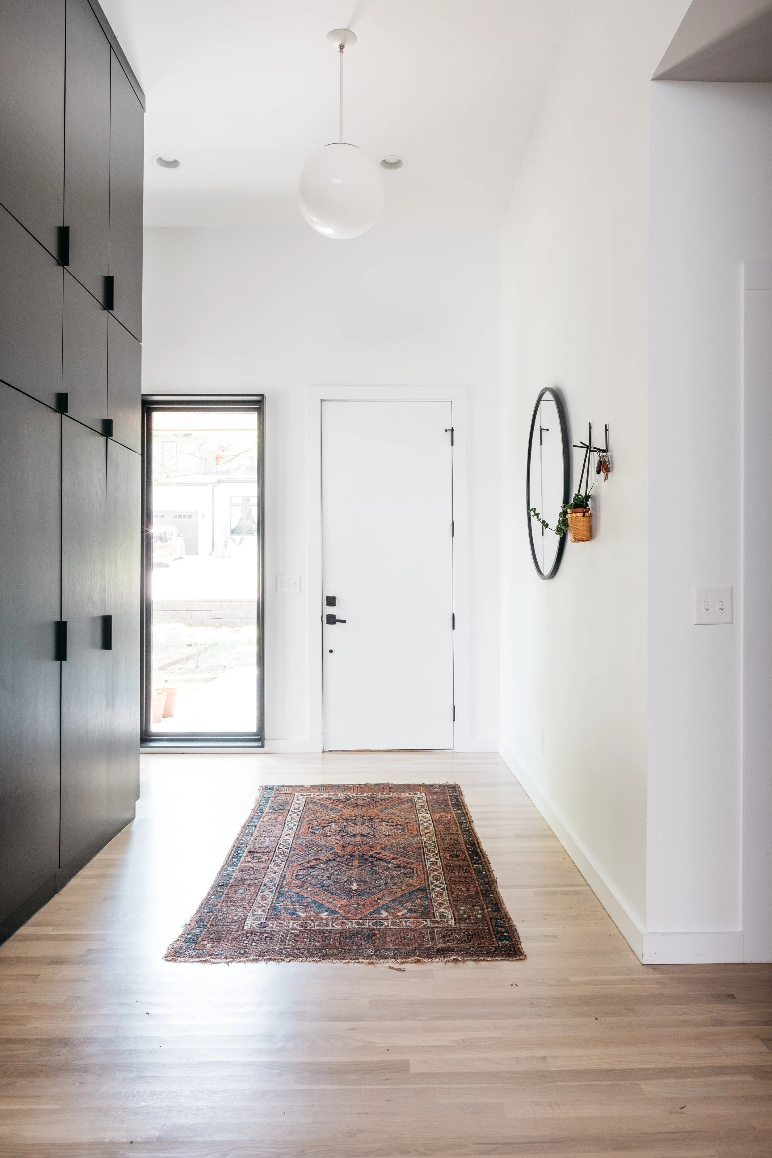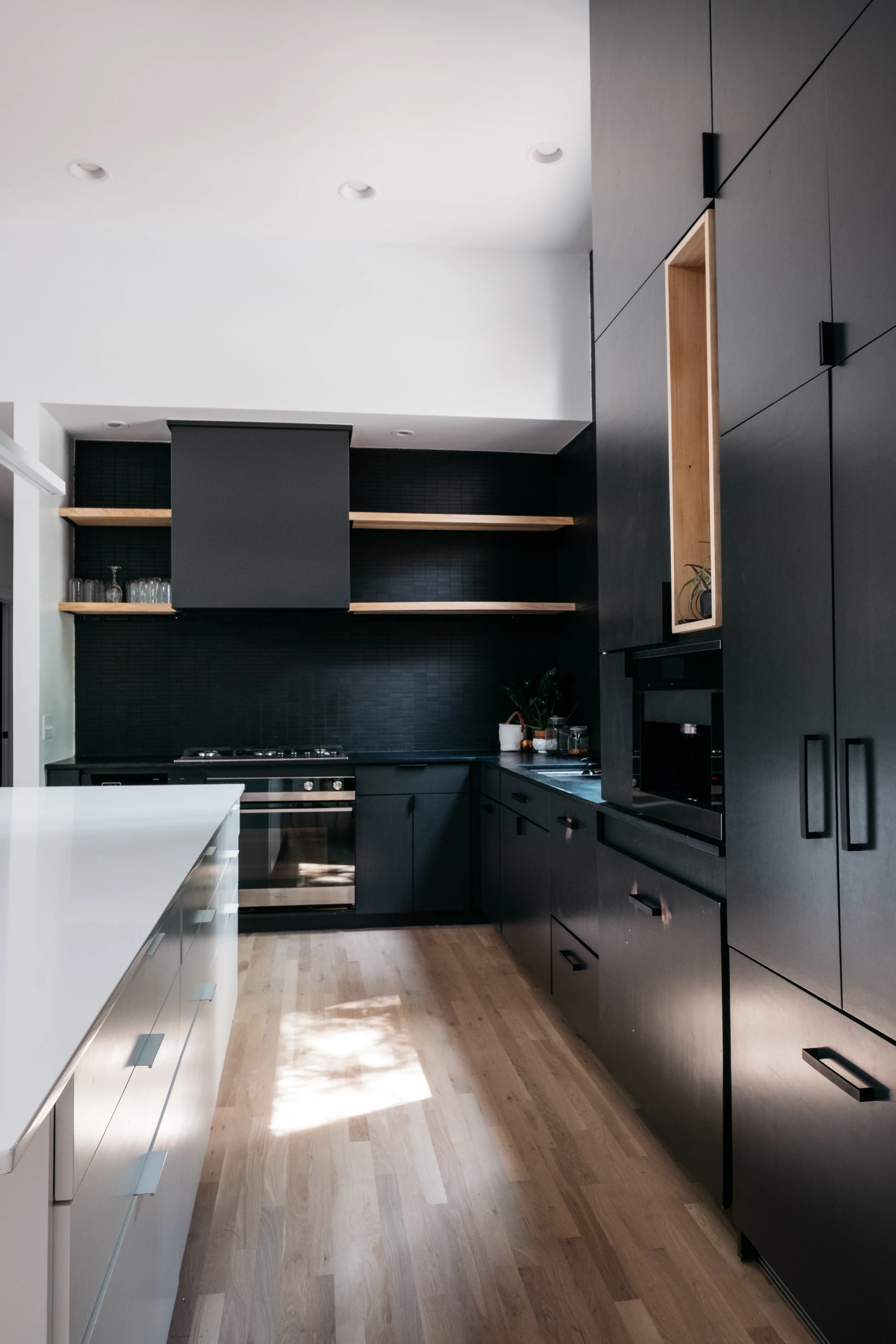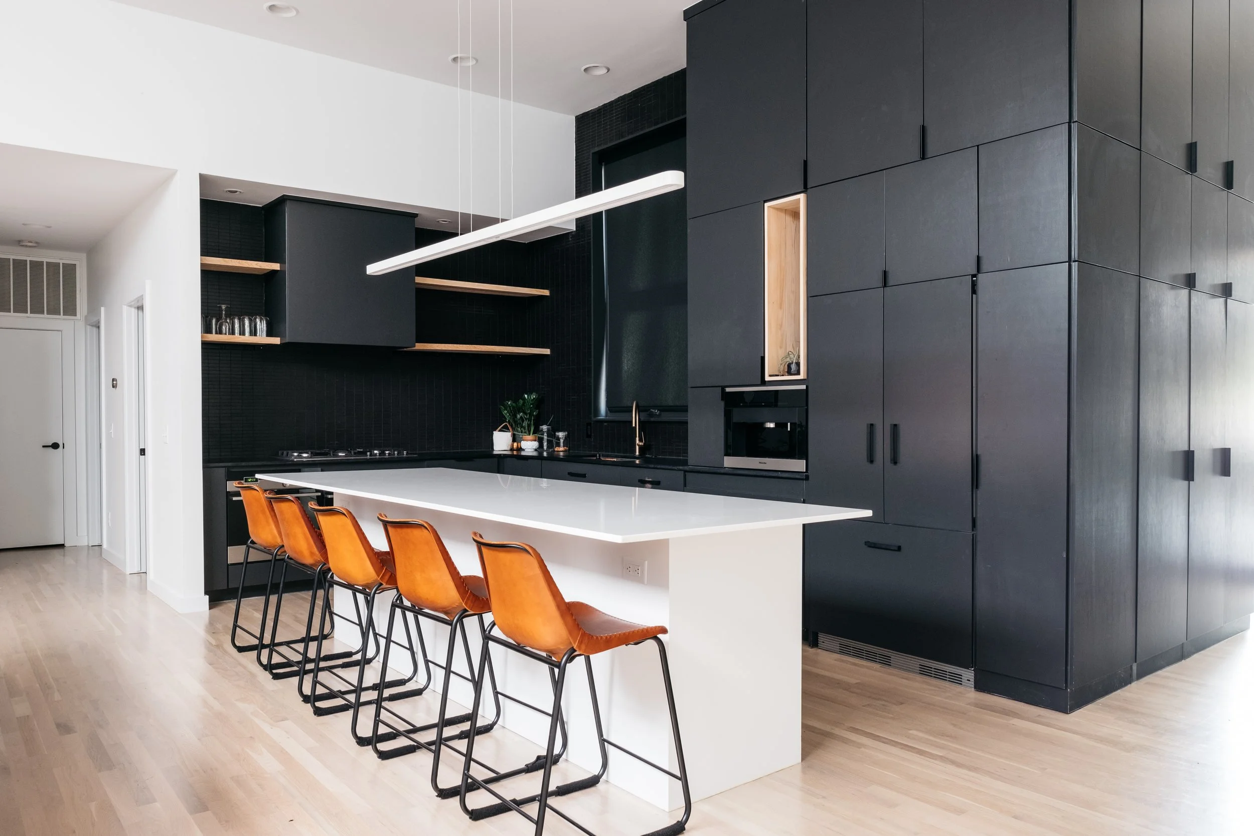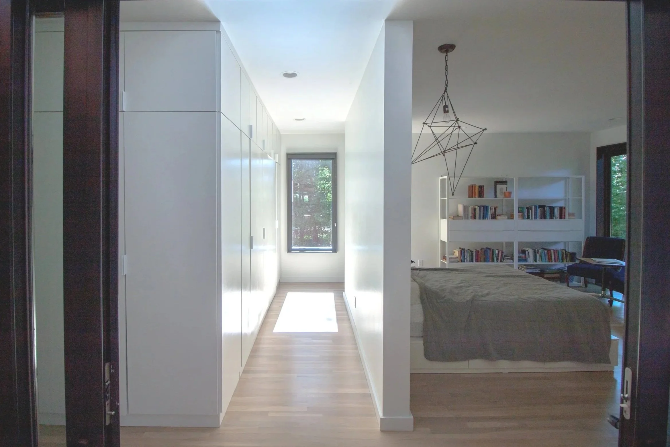 Custom casework functions as both utility and architecture, wrapping utility zones, framing entries, and articulating transitions between spaces. In some cases, it becomes wall; in others, it forms discrete masses that carve voids, acting as formal and spatial thresholds. At the entry, this language culminates in an excavated porch, a carved block within a solid volume, that signals arrival through architectural subtraction.